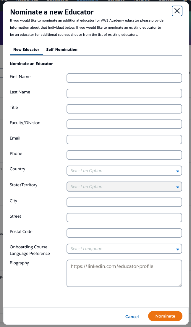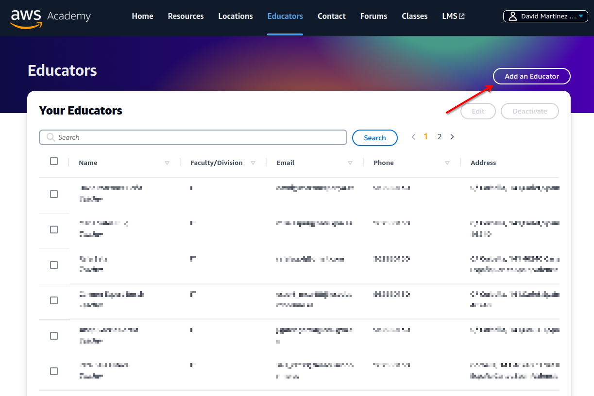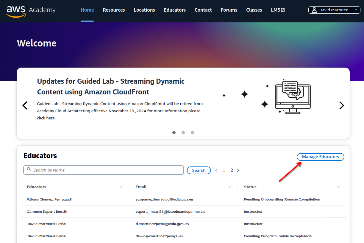 Nominación de docentes. Una vez hayas iniciado sesión y estés dentro de la plataforma de AWS Academy, haz clic en la pestaña de docentes (Educators):