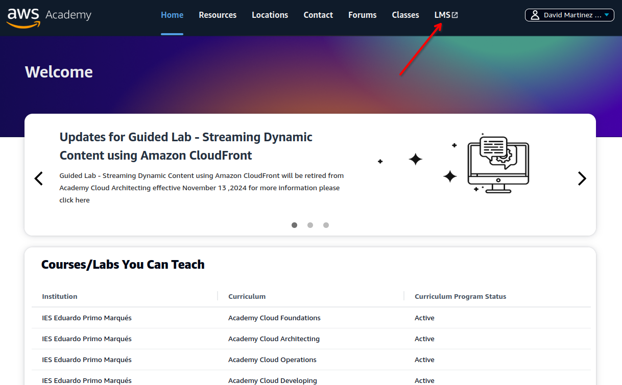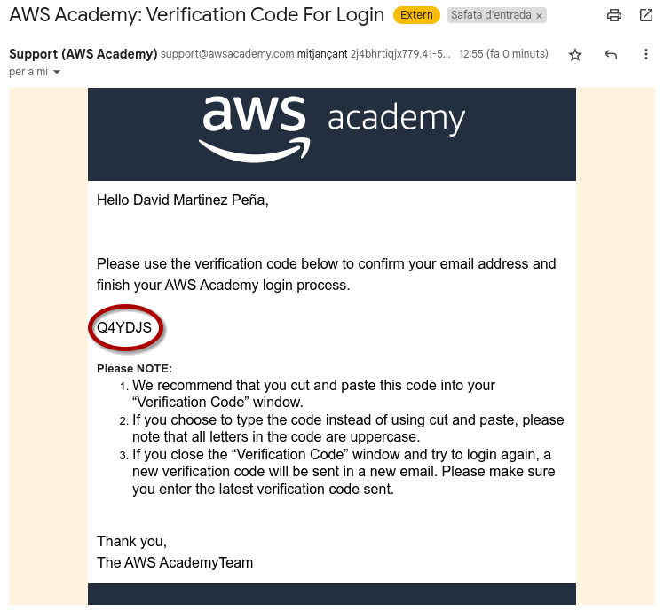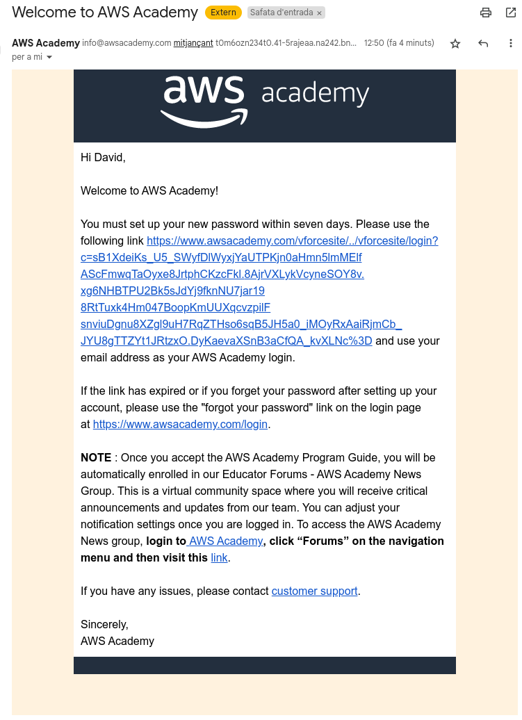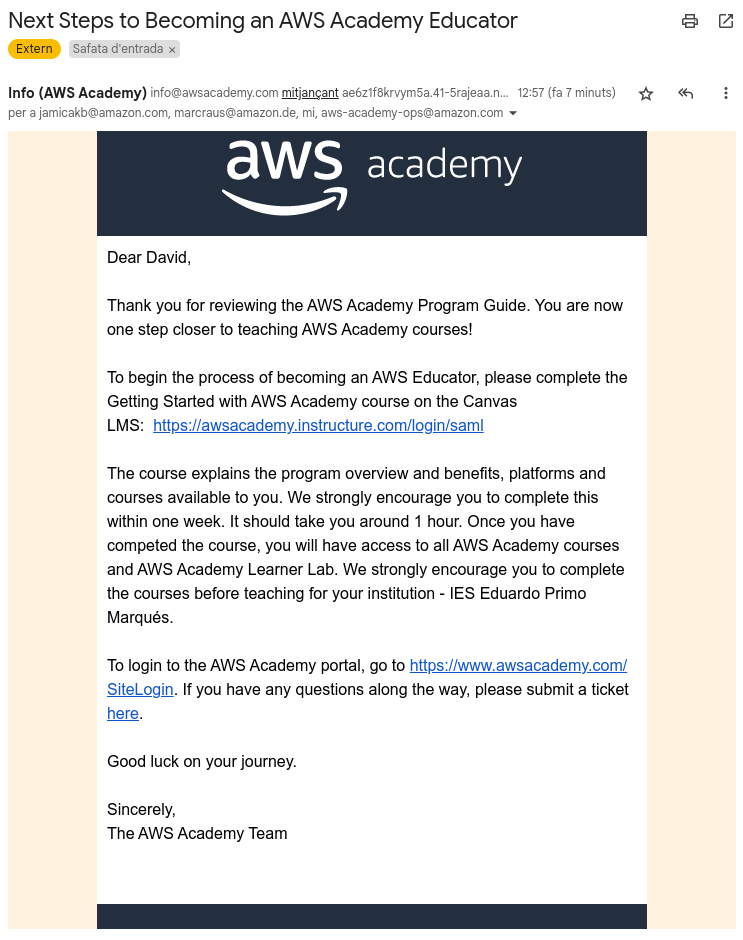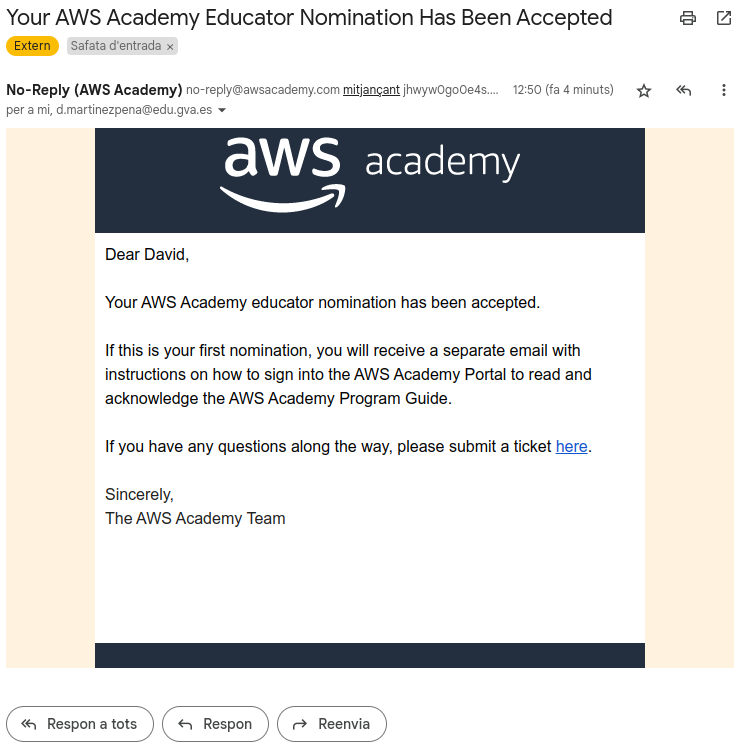 Parece que recientemente han cambiado la forma de activar la AWS Academy y ahora el CPOC debe asistir a una sesión online como último paso para activar AWSAcademy en su centro como puedes ver en el siguiente correo: