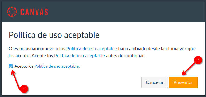 Deberemos a continuación "Aceptar las políticas de uso aceptable" y por último hacer clic en el botón "Presentar"