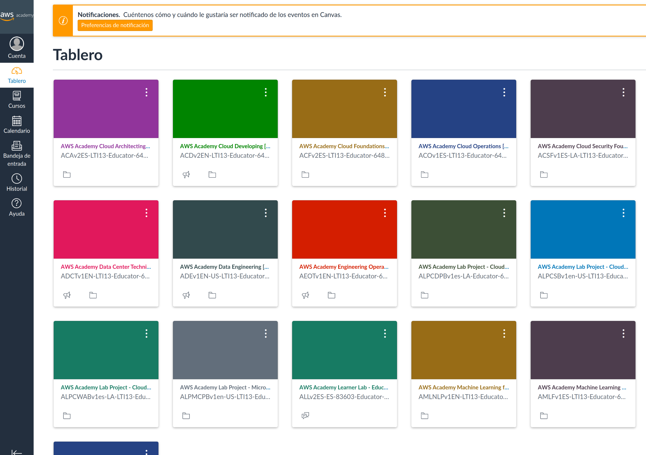Y cuando vayamos a nuestro tablero del LMS ya podremos ver todos los cursos y Learner Labs disponibles: