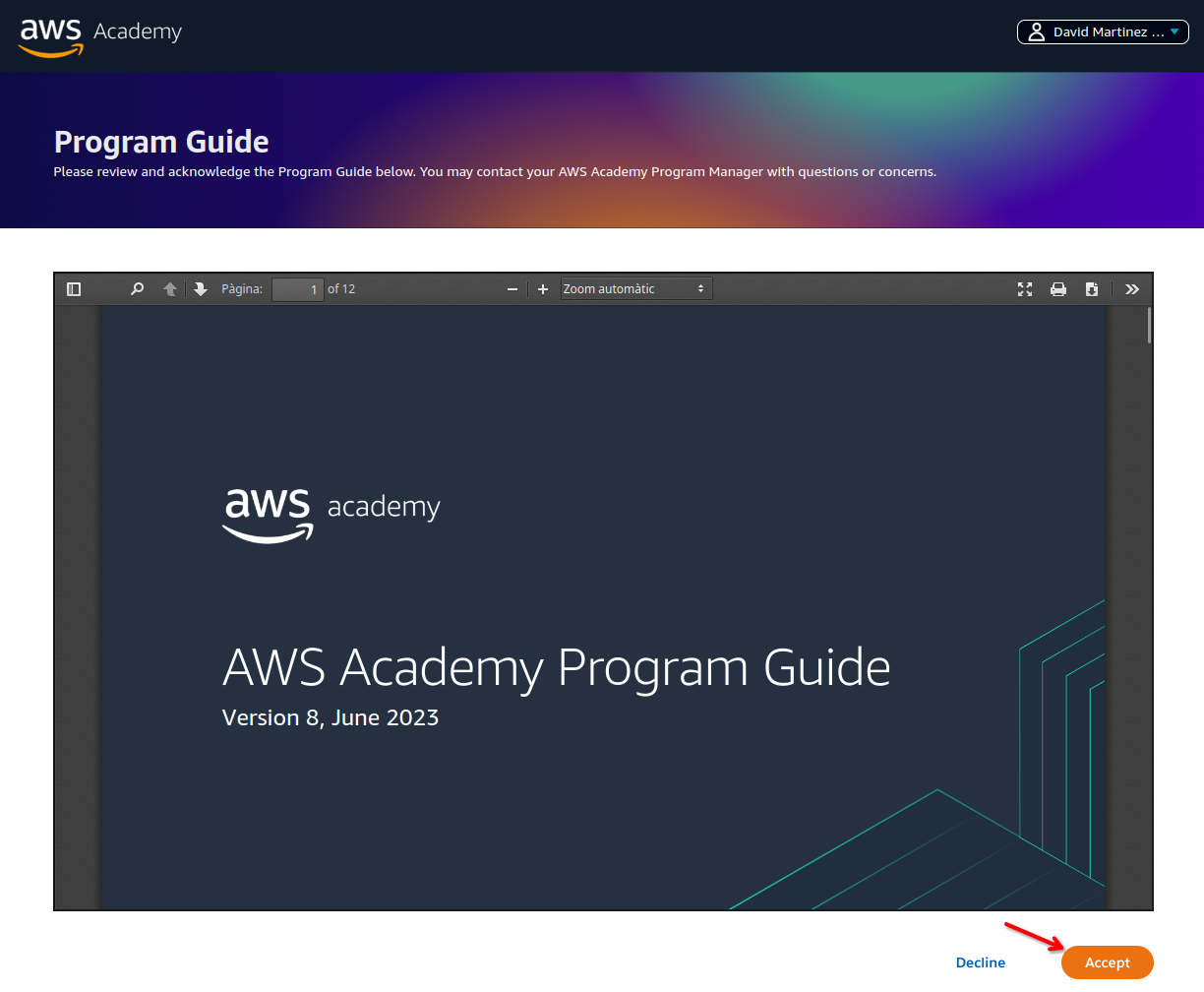 Guía del programa. Una vez hayas iniciado sesión, te aparecerá la guía del programa. Para seguir con el proceso de incorporación a AWS Academy, lee la guía y haz clic en el botón “Acknowledge”